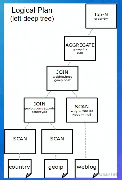 所谓逻辑计划树,可以理解为逻辑地描述一个 SQL 如何一步步地执行查询和计算,最终得到执行结果的一个分步骤地计划。树中每个节点是是一个算子,定义了对数据集合的计算操作(过滤,排序,聚合,连接),边代表了数据的流向,从孩子节点流向父节点。之所以称它为逻辑的,是因为算子定义的是逻辑的计算操作,没有指定实际的算法,比如对于逻辑的排序算子,逻辑计划树里没有指定使用快排还是堆排。