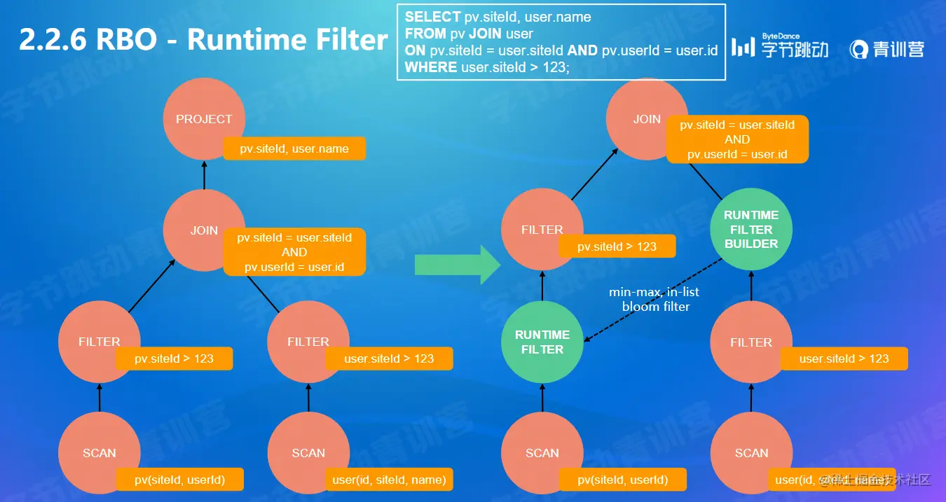 JOIN中使用的两个表往往是一个大表一个小表,例如通常进行JOIN时候会选取事实表和多个维度表,也诸如星型结构和雪花型结构的查询,因此这个假设在大多数情况下是可以成立的。通常情况下对小表扫描的(HdfsScanNode)执行速度要快于大表(毕竟数据量小很多),这样可以先对小表执行扫描操作,将输出的记录交给JOIN节点,而大表则会主动等待一段时间(默认是1s),JOIN节点会根据小表输出的记录计算出一个过滤条件,这个条件就是RF。