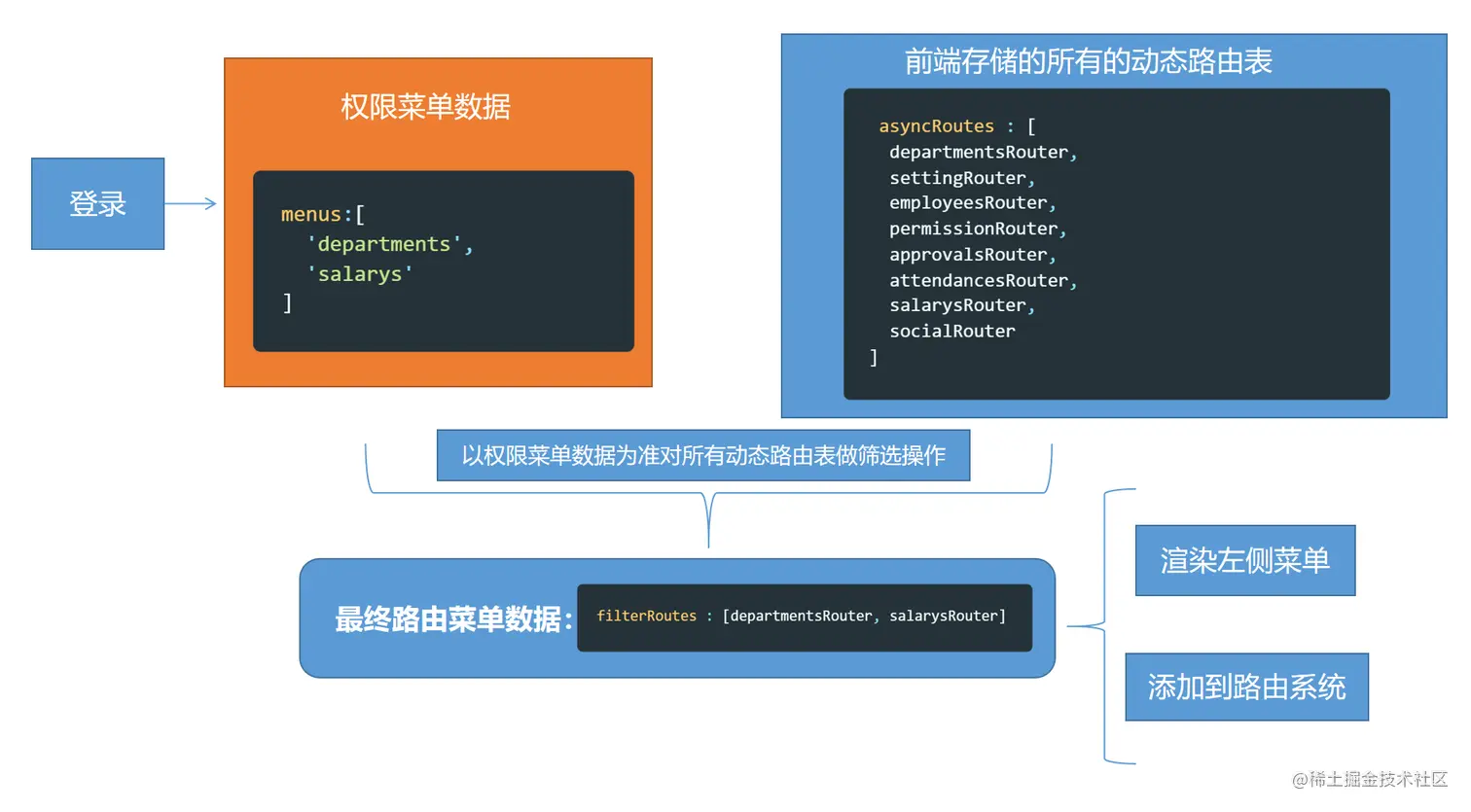 // 根据本用户实际的权限menus去 asyncRoutes 中做过滤,选出本用户能访问的页面