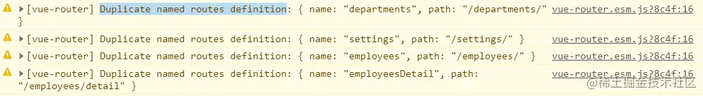 路由设置是通过router.addRoutes(filterRoutes)来添加的,退出时,并没有清空,再次登陆,又加了一次,所以有重复。