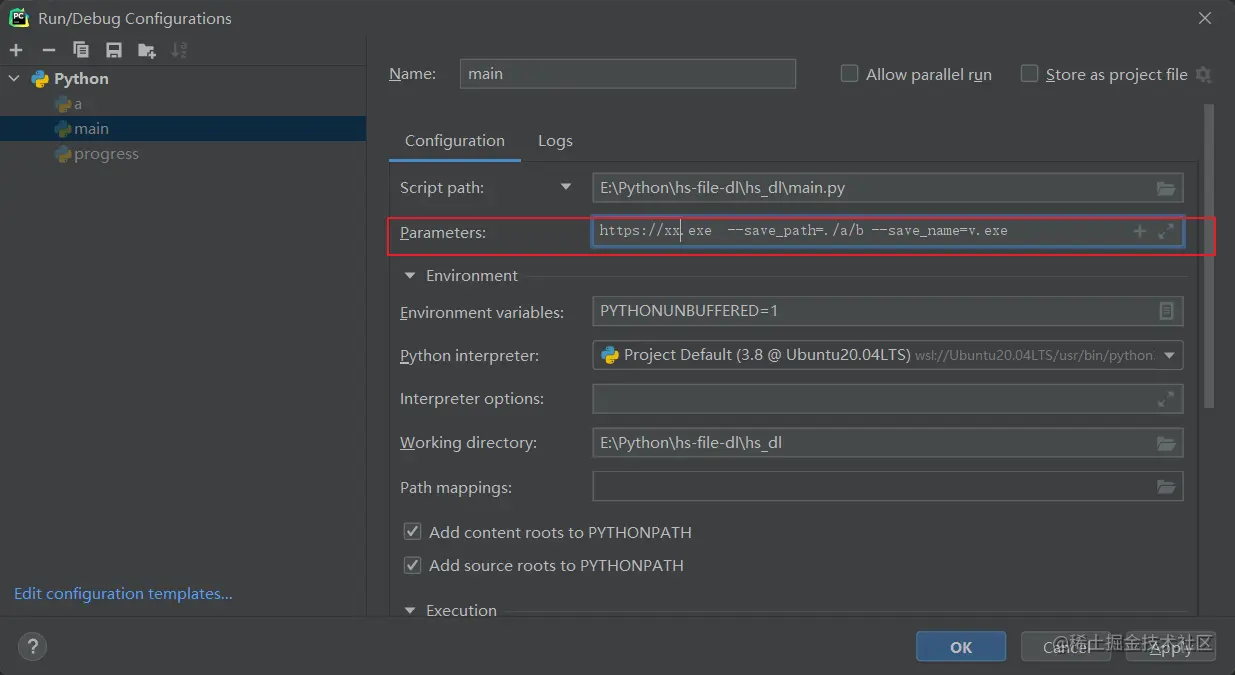 由于我们使用了命令行的方式运行程序,那么直接从IDE里面运行肯定就运行不了,那么我们一定要在代码里面写测试代码吗?肯定不至于用这么不优雅的方法,如果大家使用的Pycharm的方法运行的程序,可以这样用: