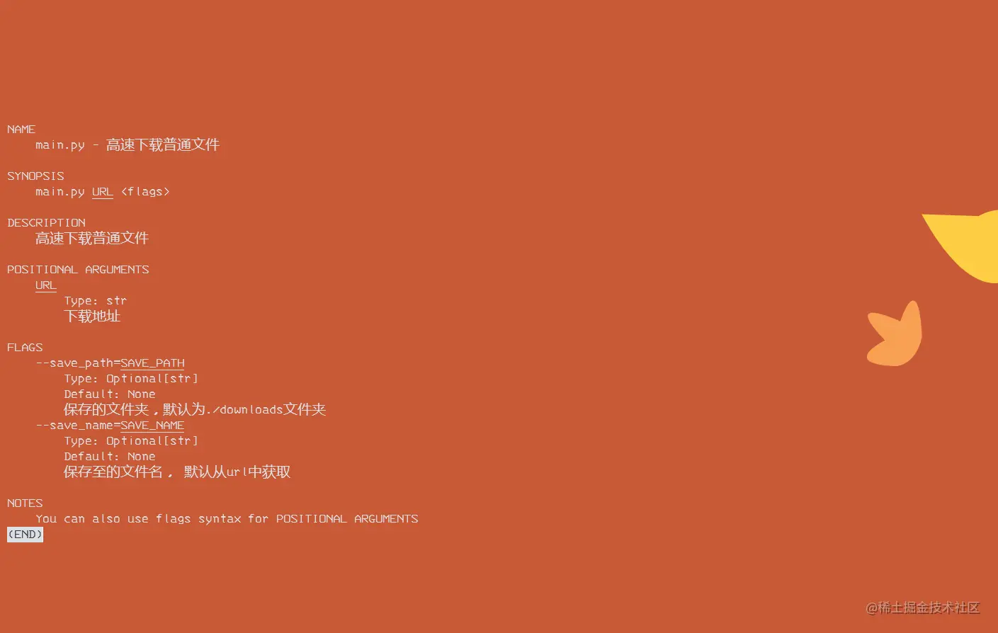 这里把程序的启动方法修改了一下,把之前的__main__里面asyncio.run(main())异步运行main方法修改成了由Fire来运行我们的程序,但也不需要担心,Fire会自动失败函数是异步还是同步然后选择不同的方式去运行。然后我们在main函数里面加了一个位置参数,两个可选参数,并且都设置了参数类型和注释,这些做在运行程序的时候就会自动识别,下面是效果: