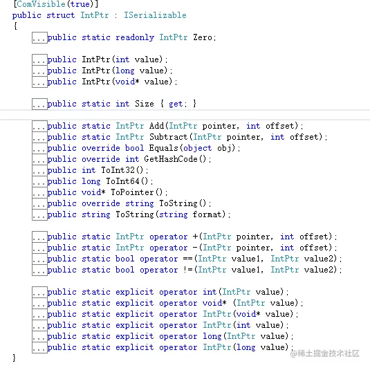 从图中我们可以看到,句柄IntPtrt里包含创建指针,获取指针长度,设置偏移量等等方法,并且为了编码方便还声明了些强制转换的方法。