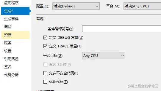 想启用C#的非安全代码设置也很简单,右键项目—属性—生成,如下图所示: