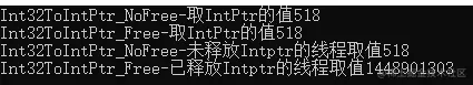 Console.WriteLine("Int32ToIntPtr_NoFree-未释放Intptr的线程取值" + afterNoFree);