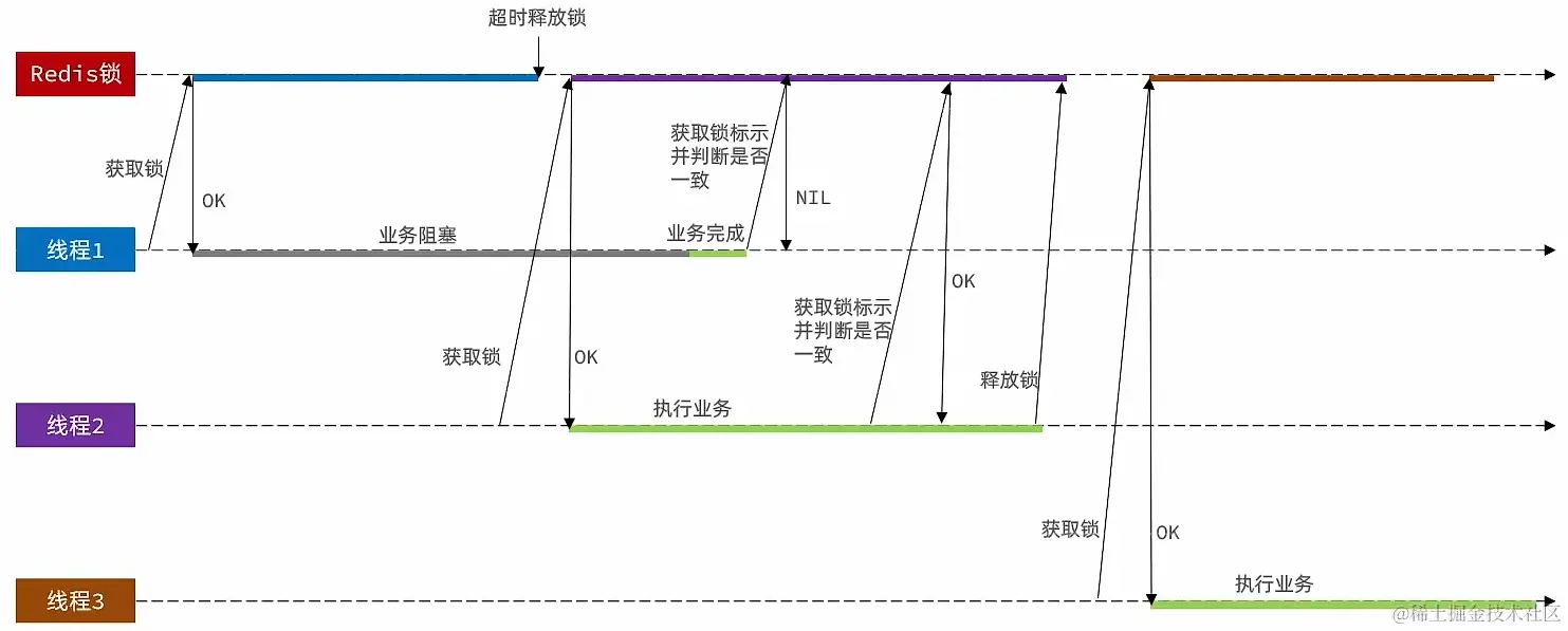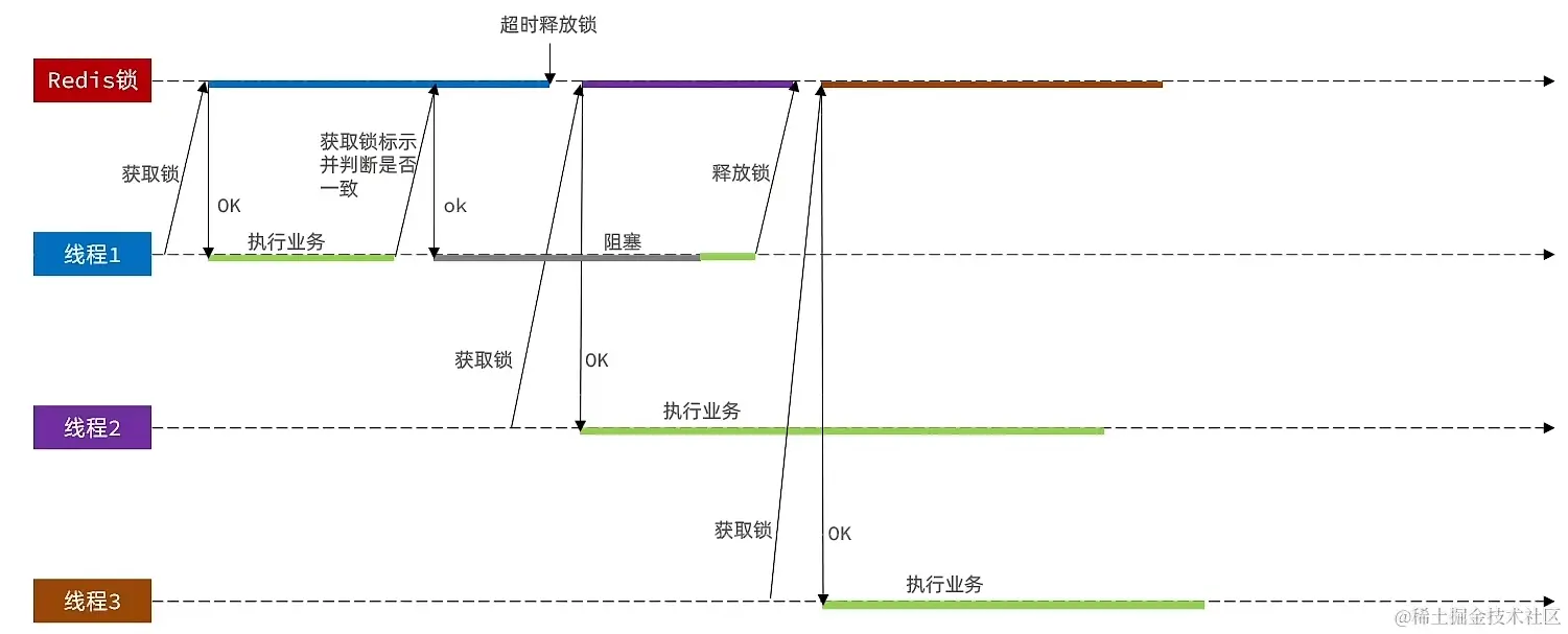 - 线程1获取到锁后去执行自己的业务,但由于某些原因业务被阻塞, 在线程1业务阻塞期间锁被超时释放,这时线程2来获取到锁去执行自己的业务,在线程2执行业务期间,线程1被唤醒也继续执行业务,线程1执行完业务后会去释放锁(相当于把线程2得到的锁给释放掉了),这时线程3来获取锁,由于线程1将锁释放掉了,线程3可以得到锁,得到锁后也去执行自己的业务,此时,线程2和线程3的业务就在并发执行,这就可能会引发线程安全