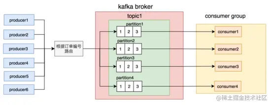 调整后按 订单号 路由到不同的 partition ,同一个订单号的消息,每次到发到同一个 partition 。