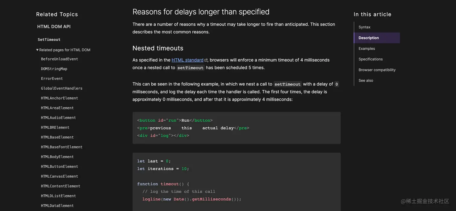 - 对于浏览器的 inactive tabs(非激活下的 tab)会有一个最小的时间延迟,这个延迟取决于浏览器厂商的实现。