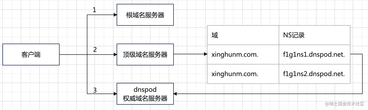 比如我申请的域名 xinghunm.com, 通过 dnspod 解析,我需要配置 NS 记录指向 dnspod 服务器,这个 NS 记录,最终会被同步到 .com 顶级域名服务器。当查找 xinghunm.com 的 IP 时,.com 服务器就知道去 f1g1ns1.dnspod.net.或 f1g1ns2.dnspod.net.去进行进一步的查找了。