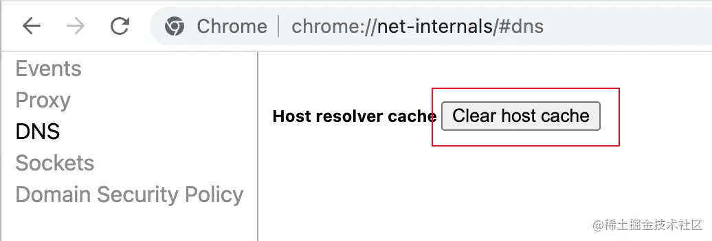 chrome://net-internals/#dns通过该命令可以打开 dns 缓存管理界面:点击 Clear host cache 以清楚缓存。