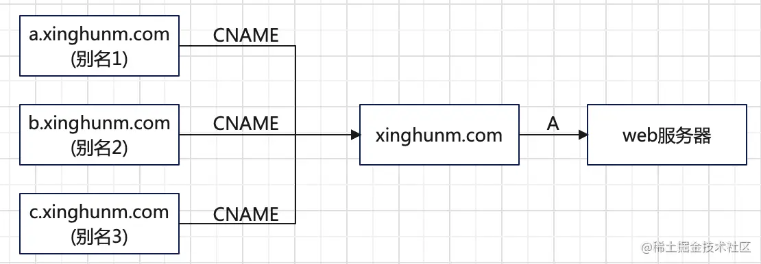 通过 A 记录指向 web 服务器 IP,然后再配置上述站点的 CNAME 记录,指向 xinghunm.com: