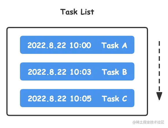 我们可以将任务存储在优先级队列(最小堆)中,堆顶的元素就是最先执行的任务,我们取堆顶任务拿到首个任务的执行时间点,然后与当前时间点相减,得到一个时间间隔 ,这样定时器就可以设定在 秒之后,等 秒时间过去之后,定时器取优先级队列中队首的任务执行,然后再计算新的队首任务的执行时间点与当前时间点的差值 ,创建新的定时器,这样定时器就不需要每隔 1 秒轮询列表了,