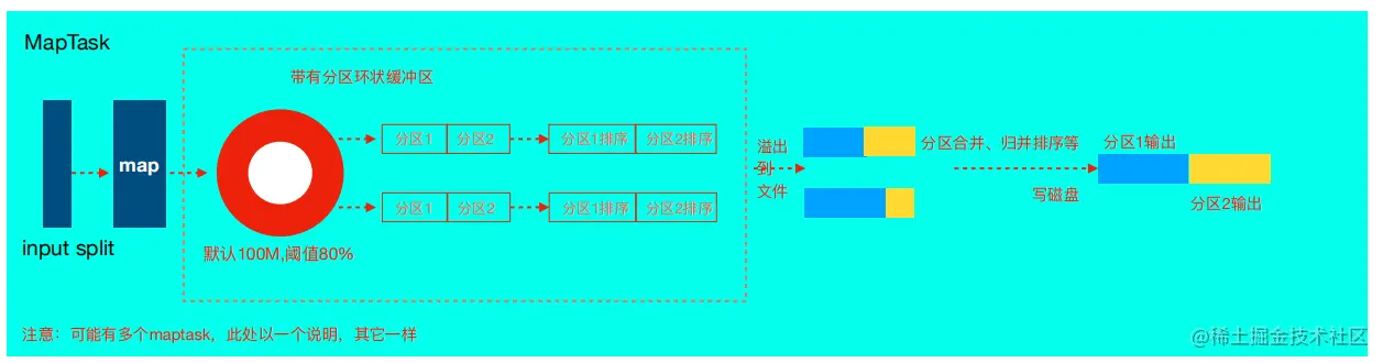 缓冲区有大小限制,默认是 100MB。当 map task 的输出结果超过阈值(总大小的 0.8,由 spill.percent 控制),就会往磁盘写数据。这个从内存往磁盘写数据的过程被称为 Spill,中文可译为溢写。溢写操作会单独开一个线程,并锁定这 80M 内存,执行写入,而 map task 的输出结果还能往剩下的 20MB 内存中写。