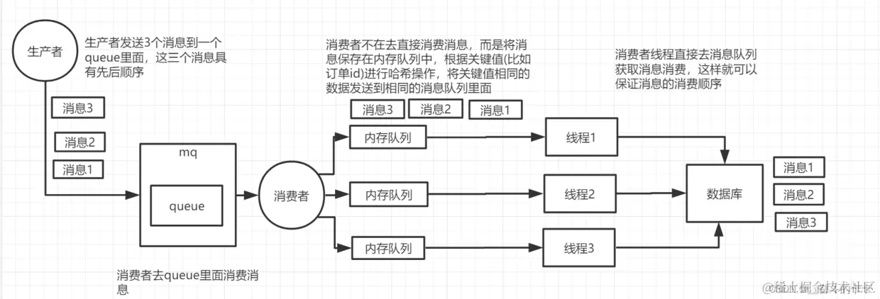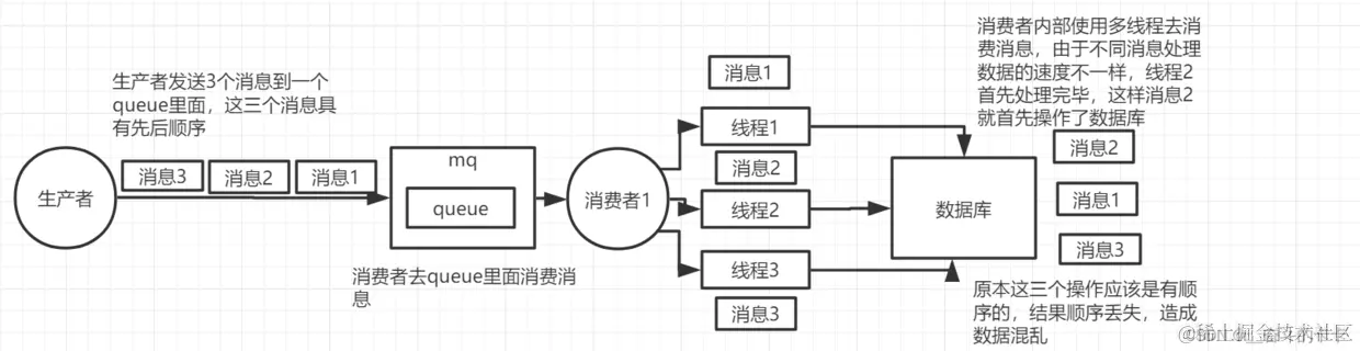 一个queue对应一个consumer,但是consumer里面进行了多线程消费,这样也会造成消息消费顺序错误。