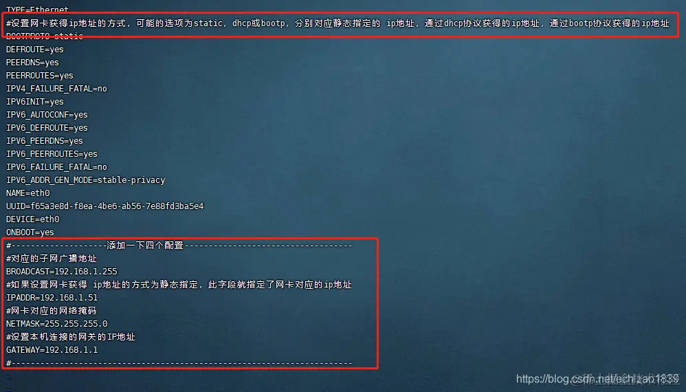 #设置网卡获得ip地址的方式,可能的选项为static,dhcp或bootp,分别对应静态指定的 ip地址,通过dhcp协议获得的ip地址,通过bootp协议获得的ip地址