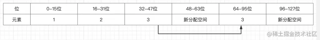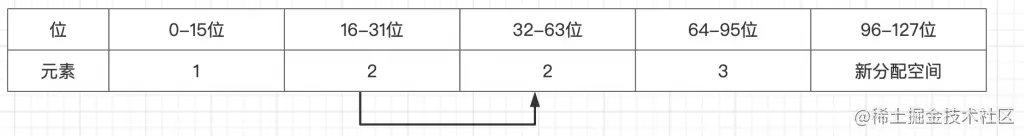 此时我们要向这个集合里添加一个类型为int32_t的整数65535。因为65535的类型比目前数组中的类型要长,所以这个整数集合要先升级。那么第一个步骤就是扩展底层数组空间了。由于要升级到int32_t的类型,所以升级后的数组大小应该是 32 * 4 = 128位。