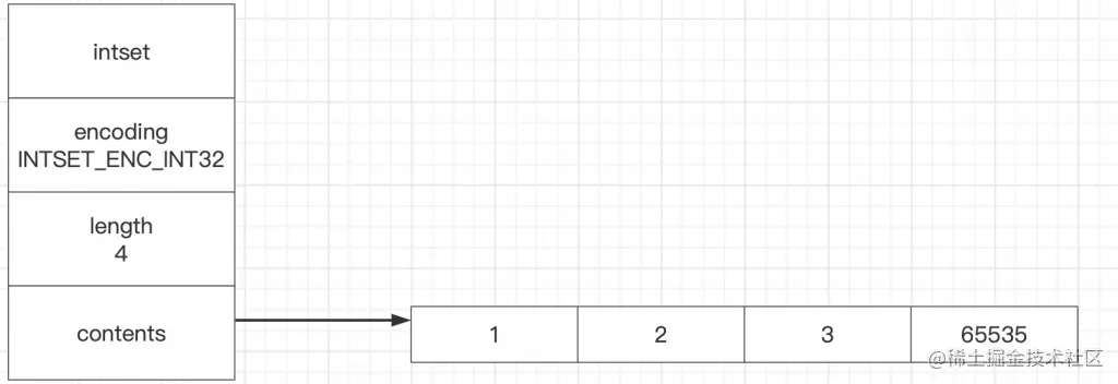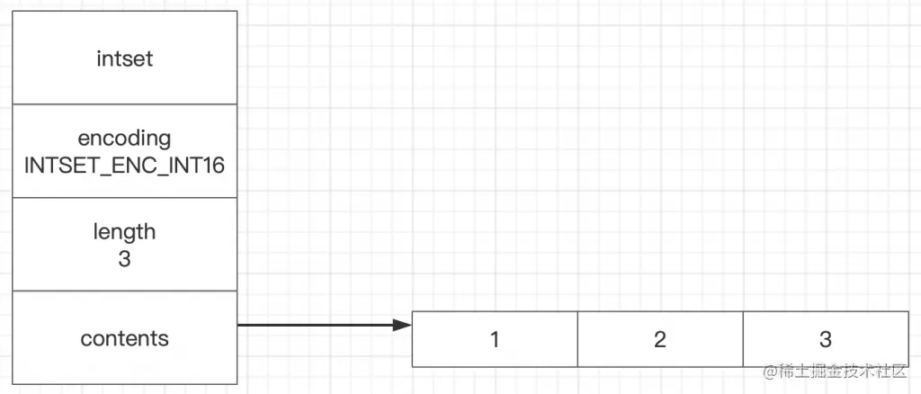 - INTSET_ENC_INT16:表示contents是一个int16_t类型的数组,取值范围是 -32,768 ~ 32,767。