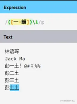 (⊙o⊙)哦这样的话国际友人就拜拜了(关于那个名字乱七八糟的家伙下面解决,之后讲边界匹配),接下来帮大龄青年解决下一个问题,名字里不能带叠字。为了简单一些,这次我们先换个思路,我们直接来筛选出名字里带叠字的人(其实你也可以使用^符号来排除他们),于是要这样做:
