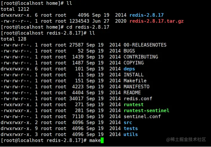 执行完make命令后,在redis-2.8.17 的 src目录下会出现编译后的 redis 服务程序 redis-server,还有用于测试的客户端程序 redis-cli\
