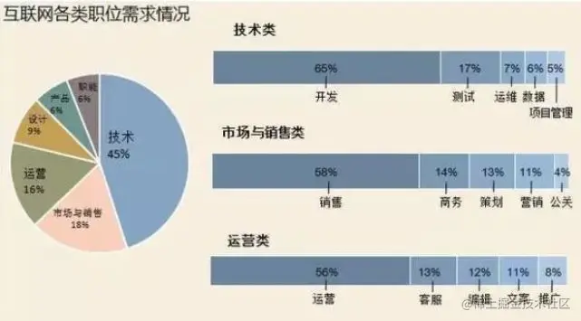 整个互联网行业是建立在计算机技术开发的基础之上,因此该行业对于技术类人才的需求占了45%左右。