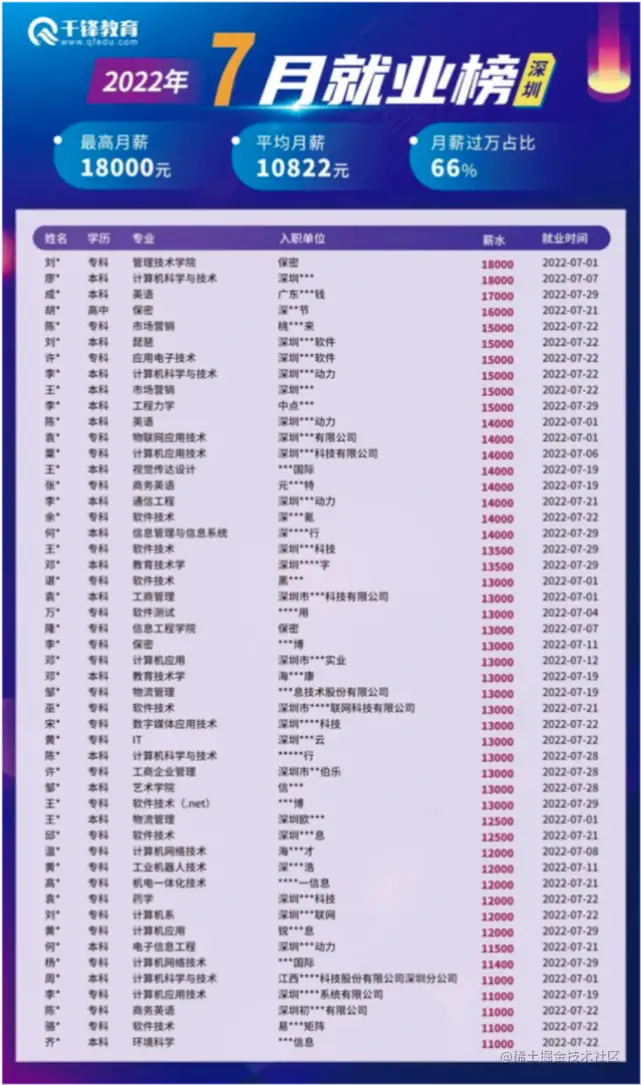 这里,给大家分享一组就业数据,千锋深圳7月份学员就业榜(部分),从就业方面大家也能看出目前开发工程师这个行业整体来说不管是发展前景还是薪资待遇都是比较不错的,值得大家尝试。
