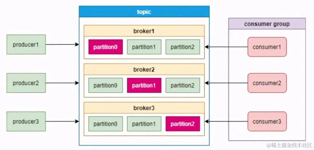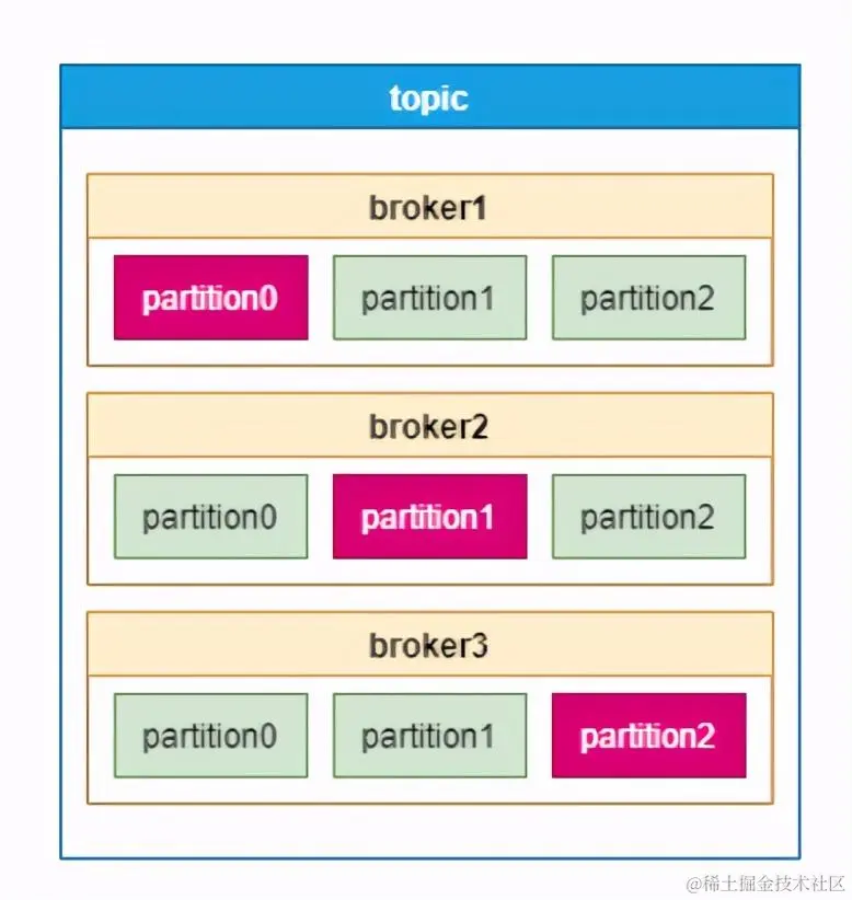 每个topic都会在不同的broker保存多个分区副本,其中只有一个副本的分区是leader分区,供消费者使用。如果某个broker宕机了,这个broker上的leader分区失效,需要在其他broker上重新进行选举。