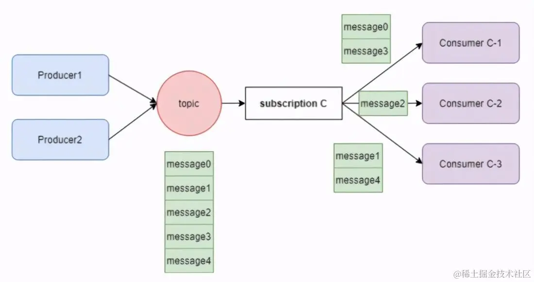 - 共享订阅(Shared):同一个topic可以由多个消费者订阅和消费。消息通过round robin轮询机制分发给不同的消费者,并且每个消息仅会被分发给一个消费者。当消费者断开,发送给它的没有被消费的消息还会被重新分发给其它存活的消费者。如下图: