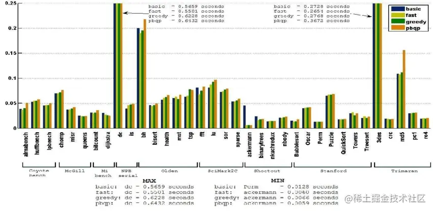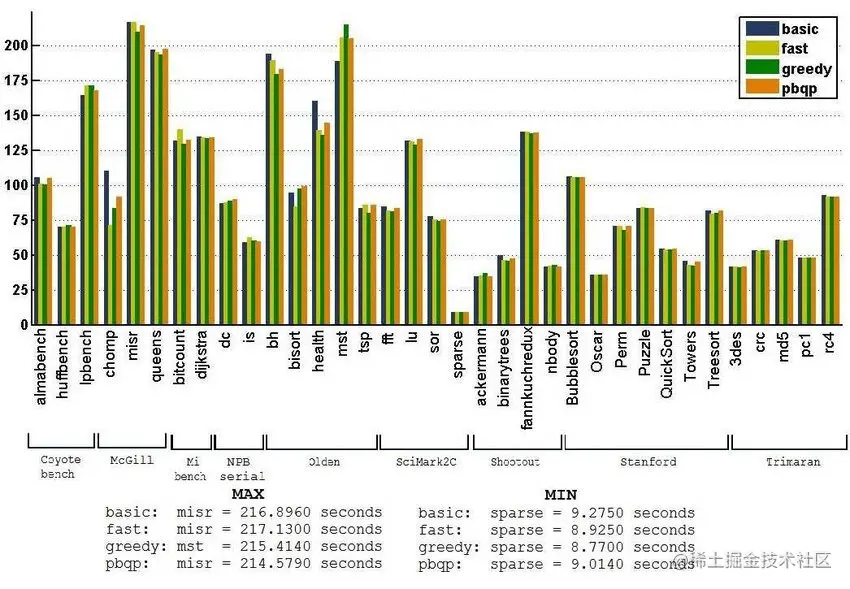 各算法的编译时间,图源[6], 横坐标是测试集,纵坐标是编译时间