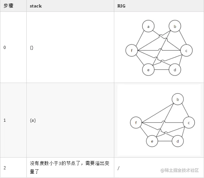 如果f的邻居是2-着色的就好了,但不是。那就只能选一个变量存入内存了。这里我们选择将变量f溢出至内存。溢出后的IR和RIG如图: