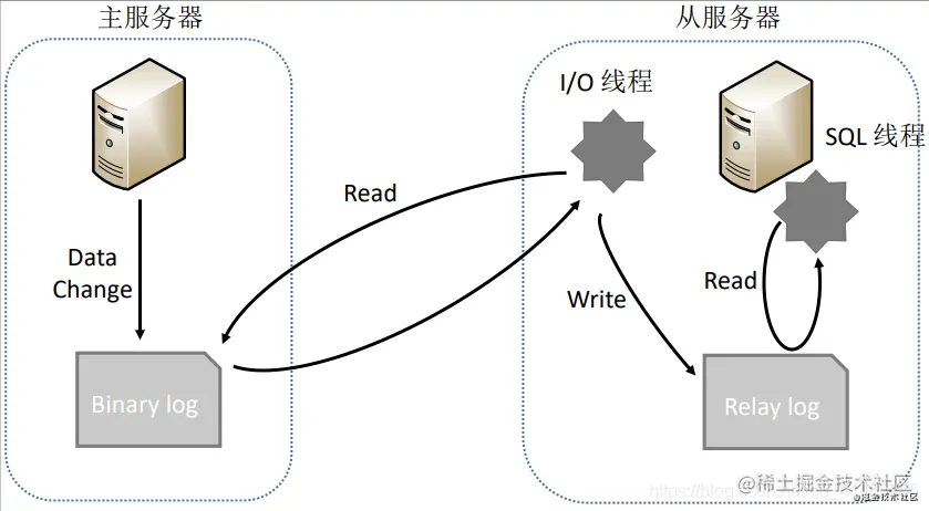 - 在介绍方案2之前我们先来介绍一下MySQL复制的原理,如下图所示: 主服务器操作数据,并将数据写入Bin log 从服务器调用I/O线程读取主服务器的Bin log,并且写入到自己的Relay log中,再调用SQL线程从Relay log中解析数据,从而同步到自己的数据库中