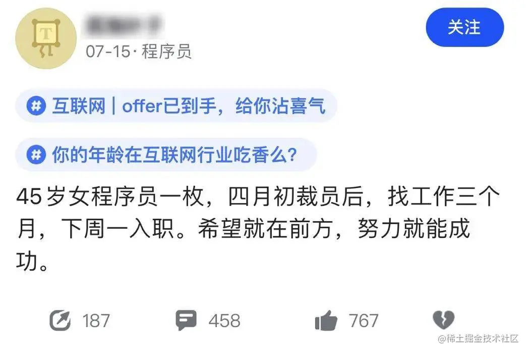 另一帖子是一位北京女程序员自述。坐标北京的大龄女程序员,四月被裁员,找工作3个月后,成功拿到了一家外企的offer。