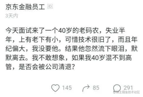 其一是京东HR的描述,今天面试了一个40岁程序员,失业半年,上有老下有小,失业的原因是太大了,技术没有跟上时代,导致被前公司辞退了。在得知没有通过面试的时候,忽然流下眼泪然后转身默默离去……