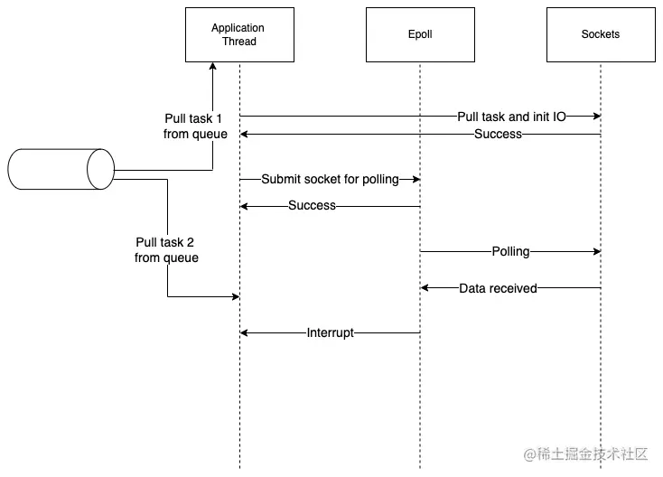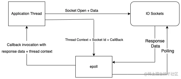 所有在epoll注册的套接字都会被持续轮询,通常是通过一个线程。有了响应数据和线程执行环境(应用线程在移交给epoll时也存储在这里),epoll会调用应用线程给它的回调。结果,一个应用线程将被中断处理输出,以恢复其从该点开始的执行流。