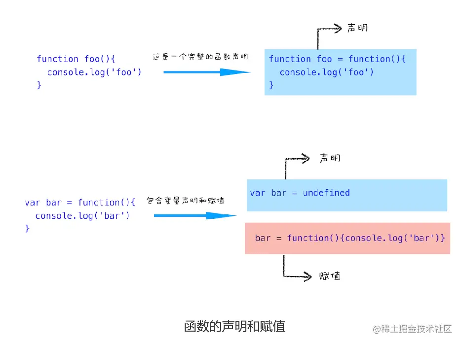 第一个函数 foo 是一个完整的函数声明,也就是说没有涉及到赋值操作;第二个函数是先 声明变量 bar,再把function(){console.log('bar')}赋值给 bar。