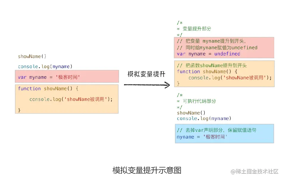 第一处是把声明的部分都提升到了代码开头,如变量 myname 和函数 showName,并 给变量设置默认值 undefined; 第二处是移除原本声明的变量和函数,如var myname = '极客时间'的语句,移除了 var 声明,整个移除 showName 的函数声明。
