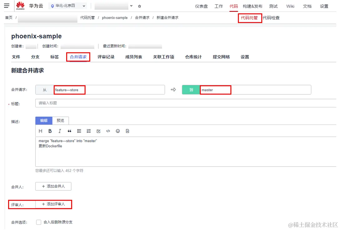 注意选择正确的分支以及评审人,评审人通常还负责代码评审的工作。