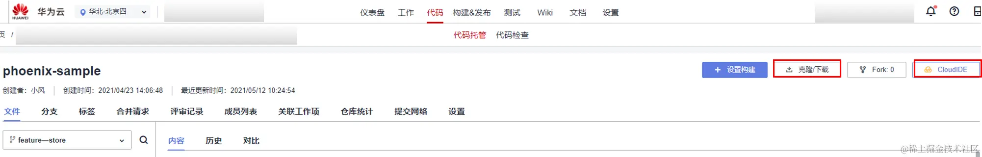 1、云上开发,首先要将代码放置在云上。可以将本地的代码导入到DevCloud中,或者直接在DevCloud创建代码包,然后代码托管服务中创建开发分支,通常是基于master分支。
