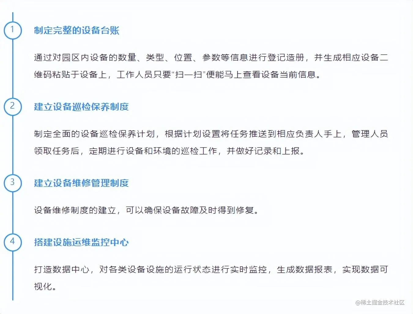 很多时候往往由于缺乏对园内设备的维护,导致有的设备设施特别是消防设备已经损坏却全然不知,当事故发生时,便有可能因此错过最佳处理时机。因此,建立完善的设备运维管理体系必不可少。