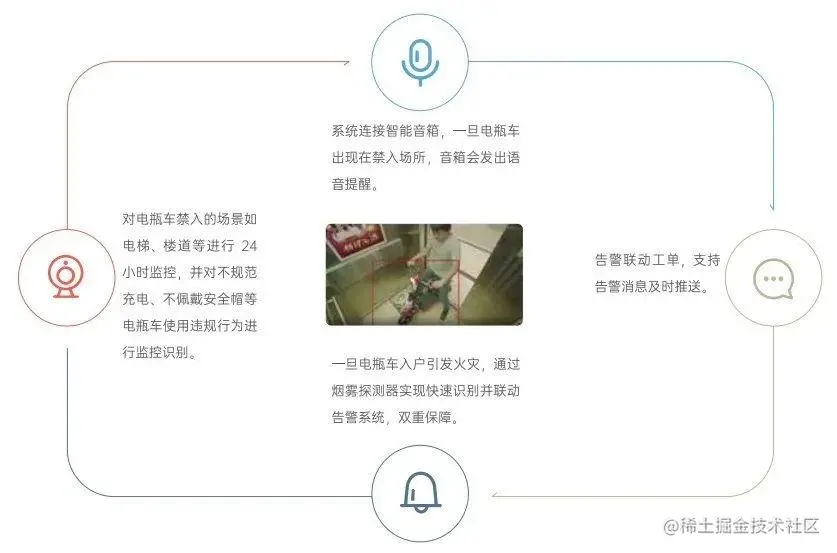 打造全场景覆盖的监控体系,如门禁管理、消防管理、高空抛物管理、电瓶车进电梯管理、水域管理、弱电井管控等,进行24小时监测,有异常及时告警,这是很多园区在安全管理上最核心的需求。举几个例子: