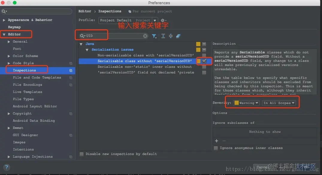 1、打开Preferences–>Editor–>Inspections,然后在右侧输入UID进行搜索(搜索方式比较快,也可以在java–>Serialization issues里找)。然后勾选Serializable class without 'serialVersionUID'后面的复选框。右侧Severity默认Warning即可。如下图:
