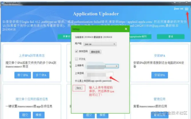 登录Appuploader软件,点击右上角,选择设置,把上传专用密码复制上去,同时勾选上保存密码,点击Save保存,然后再回去提交ipa上传就可以正常上传了。