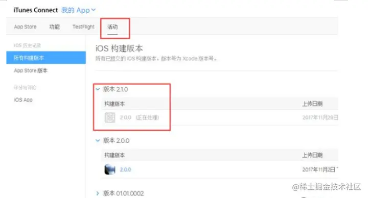 进入APP,点击活动,所有构建版本选项(下图所示),这里会显示上传成功的构建版本,如果ipa包没问题刚上传会显示正在处理!
