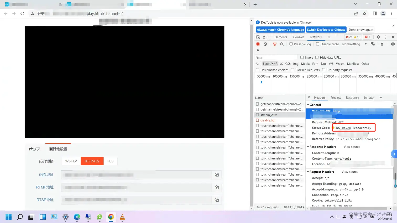 2)从上图可以看到,有一个302的状态码,这个状态码是临时重定向的意思,可以理解为这个客户端将我们输出的FLV的视频流进行了重定向。