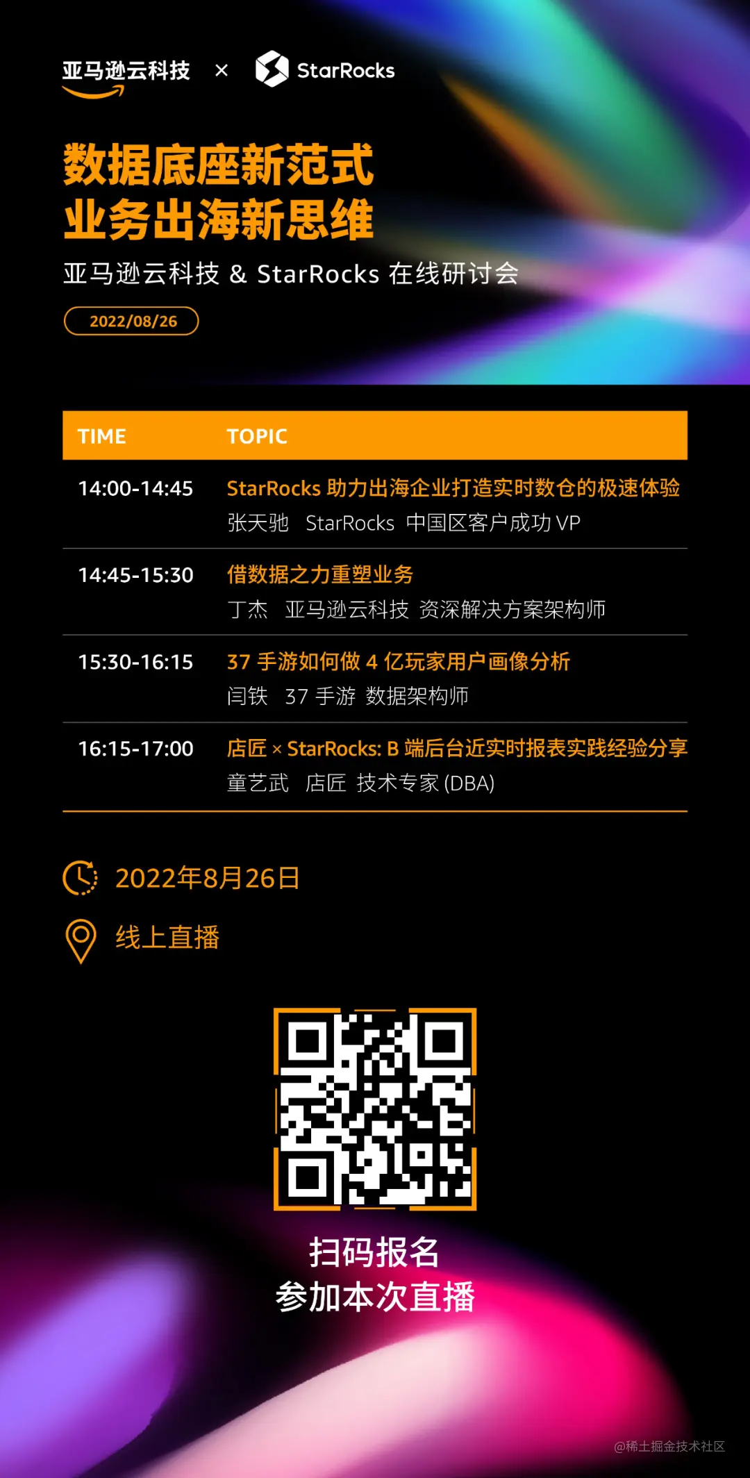 8 月 26 日,StarRocks 携手亚马逊云科技,联合 37 手游、店匠,伴以实际案例的剖析,邀您共同探讨数据底座对于出海业务的价值。扫描下方海报二维码即可报名线上会议!
