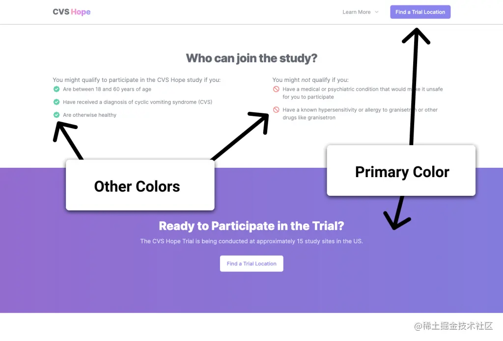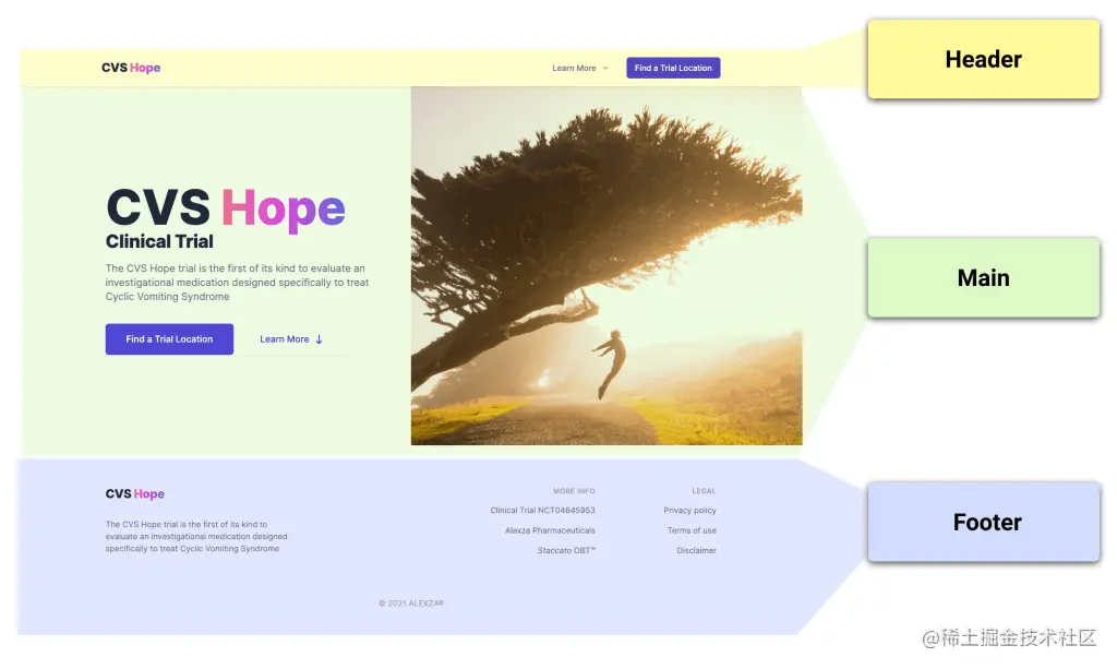 让我们以这个临床试验的网站为例。我们可以看到有很多熟悉的设计元素。营销网站往往有共同的模式: