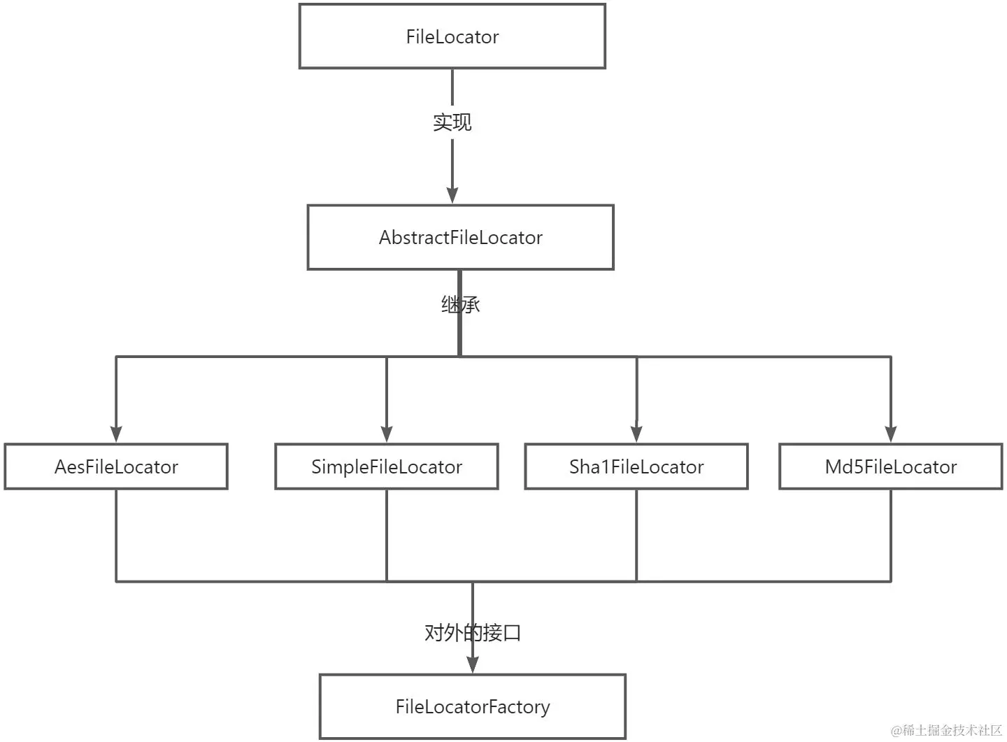 这个文件夹中的类实现了根据文件的绝对路径查找文件位置(因为文件名经过加密所以与原来的不一样),接口,抽象类,与实现文件的关系如下,文件名分别可以用aes, sha1, md5加密,或者不加密,四个Locator实现不不同的加密方法