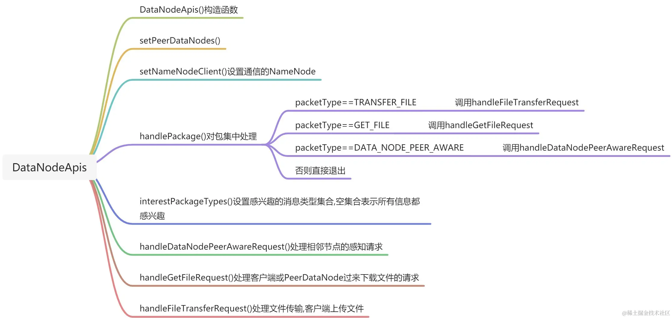 DataNodeApis继承了AbstractChannelHandler抽象类,重写了interestPackageTypes()和handlePackage()方法,可以根据不同NettyPackage的类型选择不同的处理方式