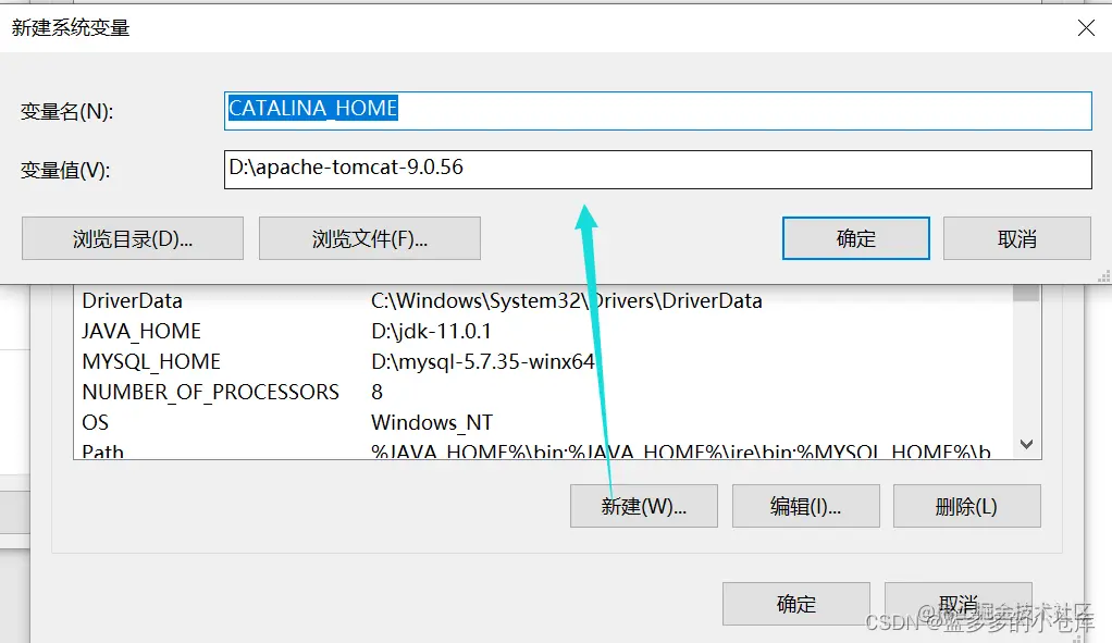 2>新建系统变量 变量名:CATALINA_HOME 变量值:D:\apache-tomcat-9.0.56 (这是你的解压目录)
