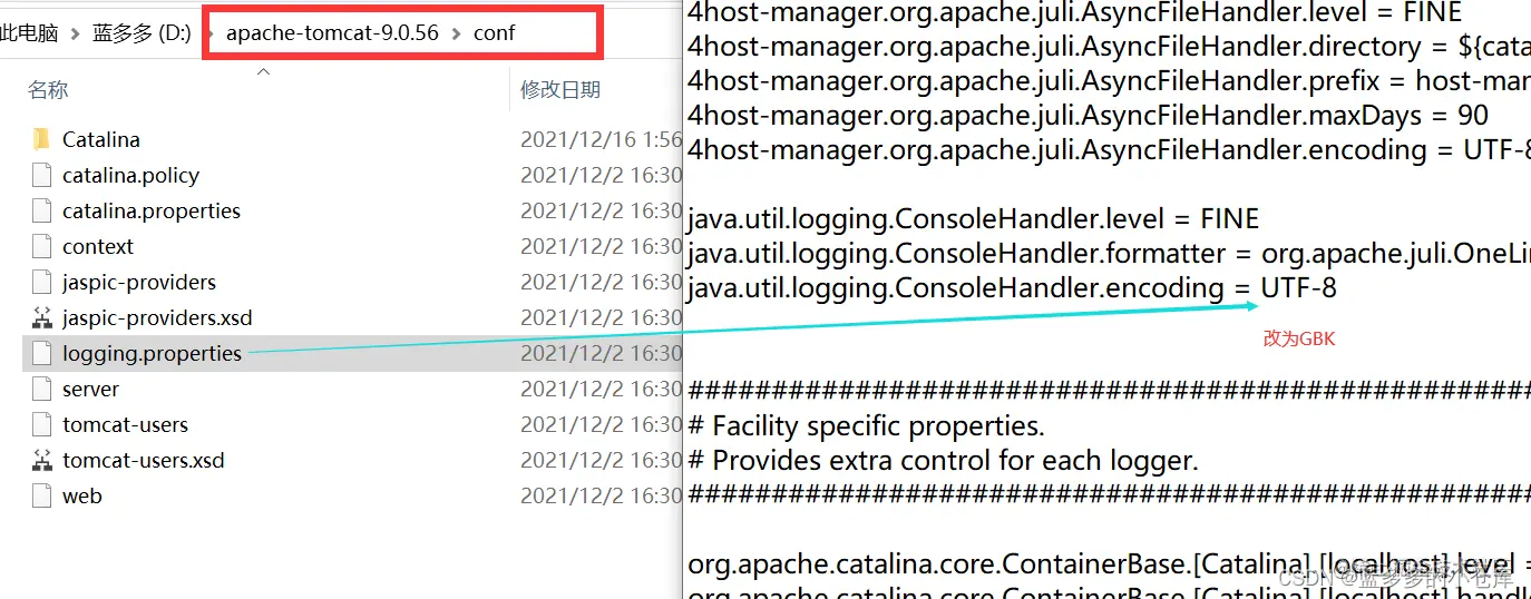 A1:方案一(推荐):进入 ......\conf 目录下,修改logging.properties文件(以记事本打开),将: