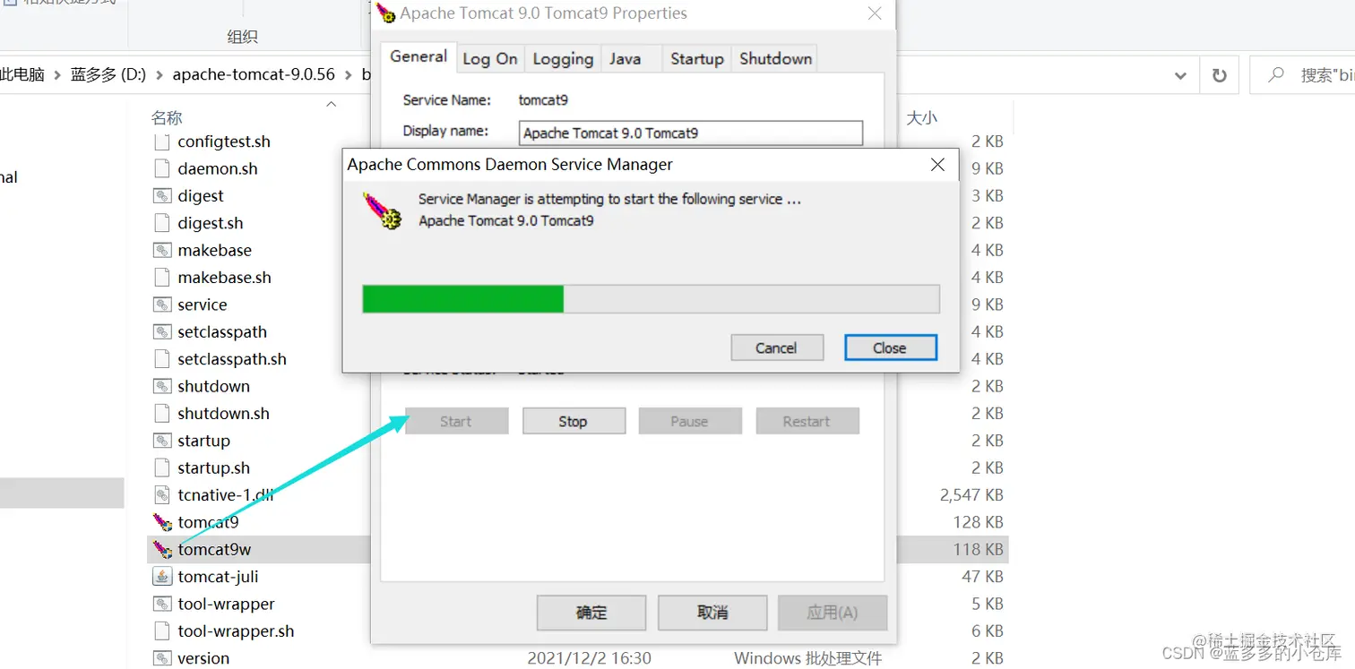 3、启动Tomcat1>启动方案一(推荐):在 tomcat 解压路径下的 bin 文件夹中双击打开 tomcat9w.exe ,在打开的软件界面点击 Start 即可。如果你是tomcat8可以直接点击startup.bat即可启动tomcat